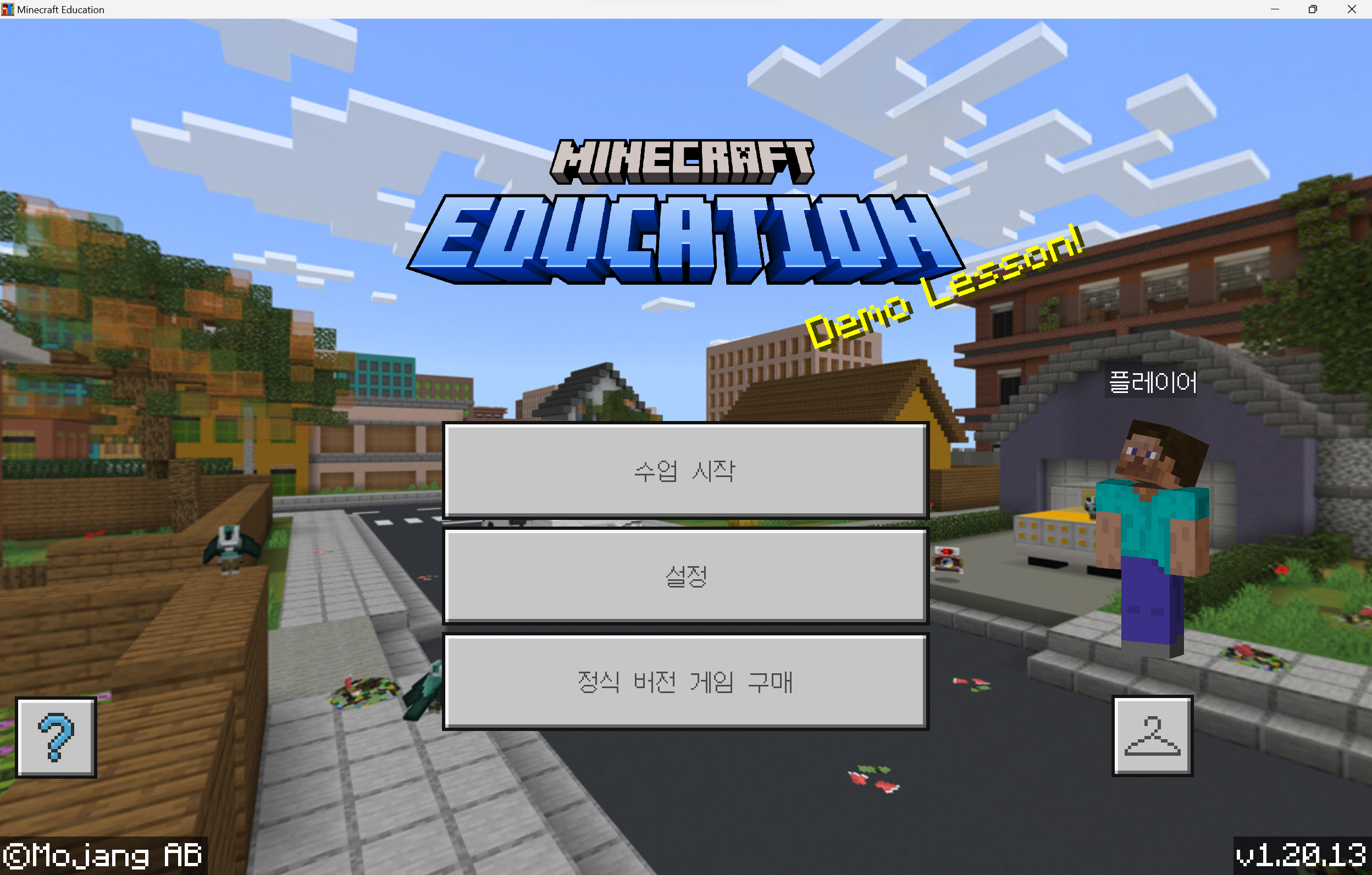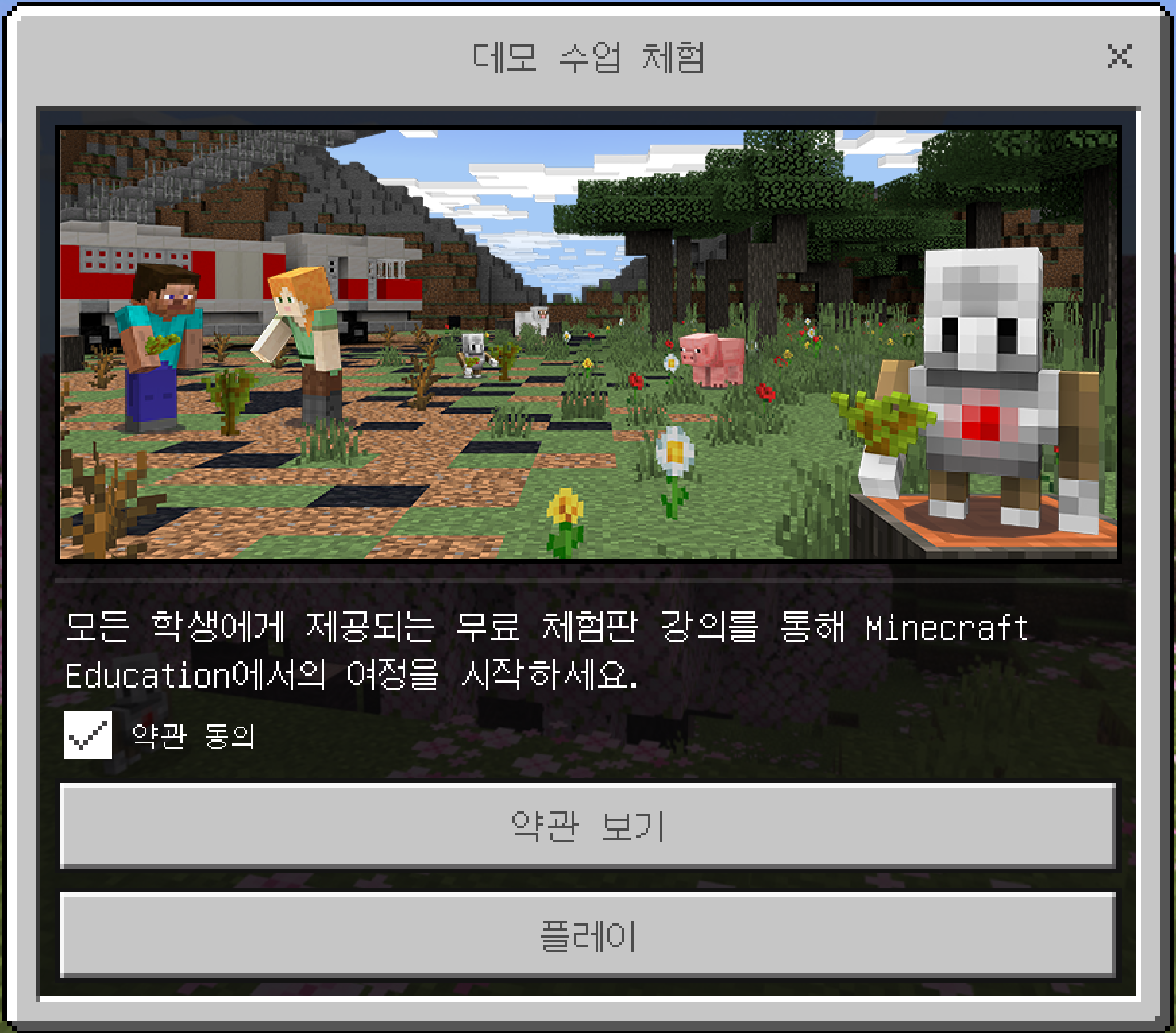 수업을 즐기세요. 마인크래프트를 처음 플레이해도 즐길 수 있도록 튜토리얼 플레이를 포함하고 있어요.