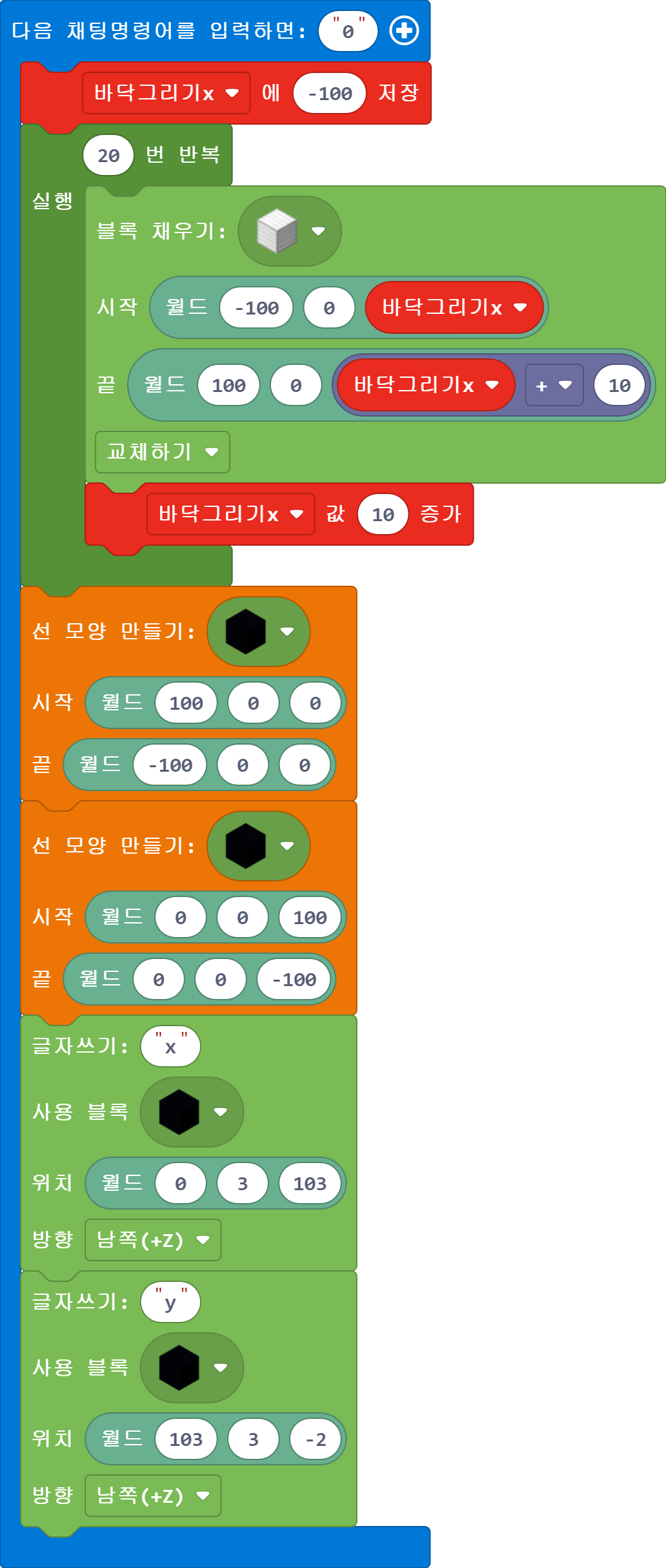 - 📈 좌표 그리기: 채팅 명령어 0을 입력해서 직교좌표계를 그려주었습니다. Y 좌표 60에서 그려집니다.