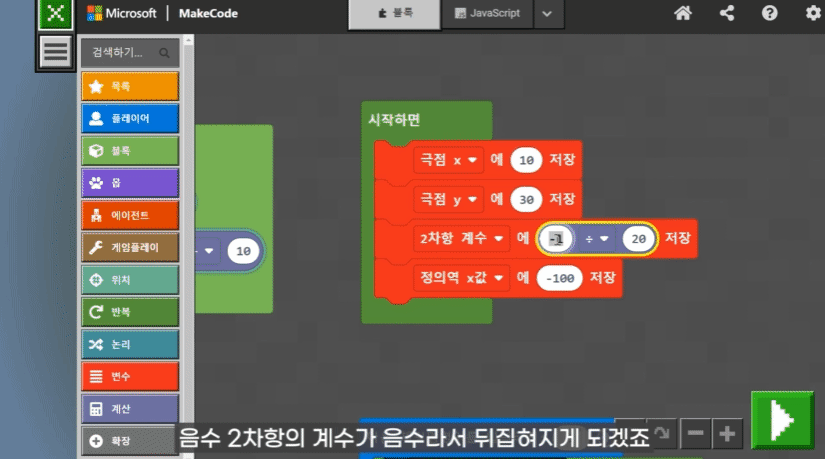 - 📝 함수 그리기: 코드 작성기를 열어 2차 함수 그래프를 그리기 위해 극점과 이차항의 계수를 설정하였습니다.