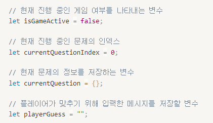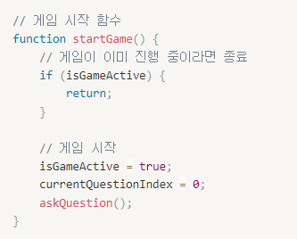 - 🚀 게임 시작 함수: 변수 isGameActive이 참이면 게임을 종료하고 거짓이면 게임을 시작합니다.