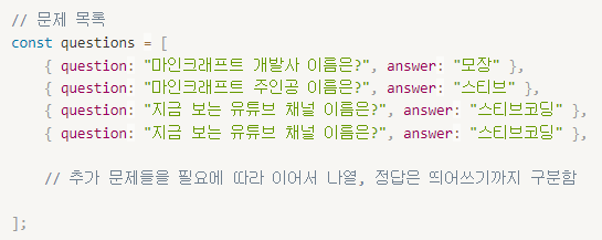 { question: "마인크래프트 주인공 이름은?", answer: "스티브" },