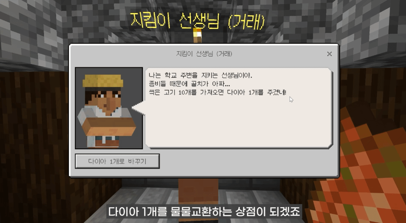 🍖 썩은 고기를 가지고 있고, 대화 후 썩은 고기와 다이아몬드 교환 가능한 상점입니다. NPC 소환은 명령어 /summon npc 입니다. 교환하고 나서 메시지까지 보여주고 있죠. 사실 메시지가 필요없다면 단 두 줄만으로 실행할 수 있습니다.